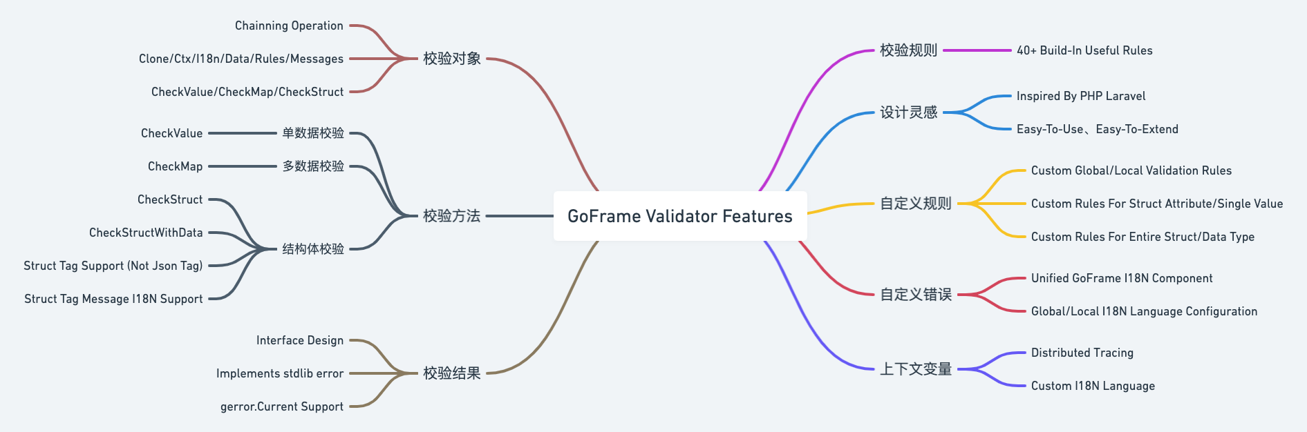 goframe 框架提供了功能强大、使用便捷、灵活易扩展的数据/表单校验组件,由 gvalid 组件实现。 gvalid 组件实现了非常强大的数据校验功能,内置了数十种常用的校验规则,支持单数据多规则校验、多数据多规则批量校验、自定义错误信息、自定义正则校验、自定义校验规则注册、支持 i18n 国际化处理、支持 struct tag 规则及提示信息绑定等等特性,是目前功能最强大的 Go 数据校验模块。