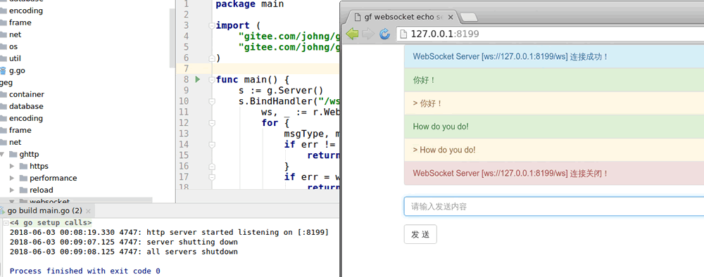 我们首先执行示例代码 main.go,随后访问页面 http://127.0.0.1:8199/,随意输入请求内容并提交,随后在服务端关闭程序。可以看到,页面会回显提交的内容信息,并且即时展示 websocket 的连接状态的改变,当服务端关闭时,客户端也会即时地打印出关闭信息。