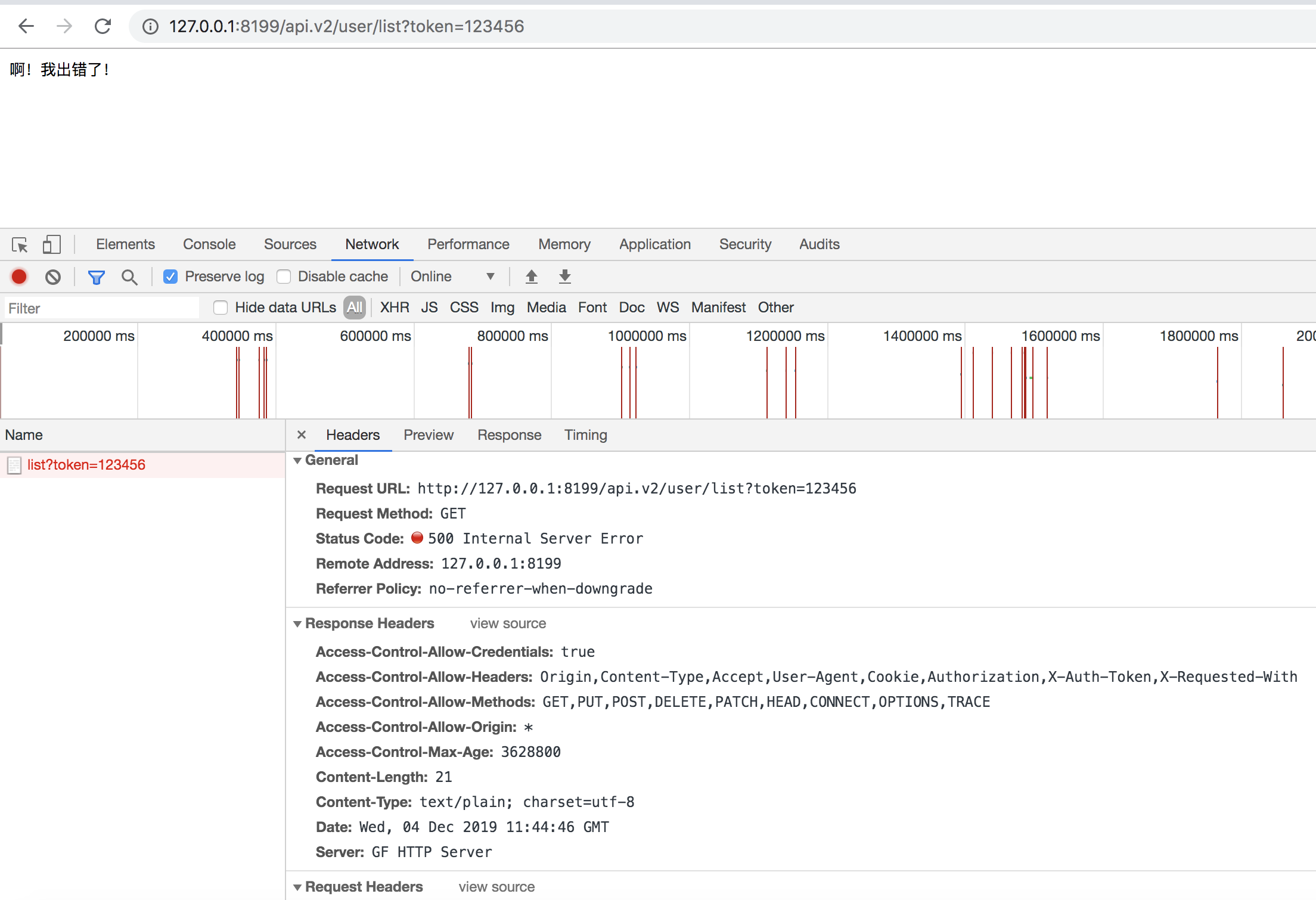 可以看到,我们的服务方法绑定了两个中间件,跨域中间件和而鉴权中间件。 请求时将会按照中间件注册的先后顺序,先执行 MiddlewareCORS 全局中间件,再执行 MiddlewareAuth 分组中间件。 随后我们可以通过请求 http://127.0.0.1:8199/api.v2/user/listhttp://127.0.0.1:8199/api.v2/user/list?token=123456 对比来查看效果。