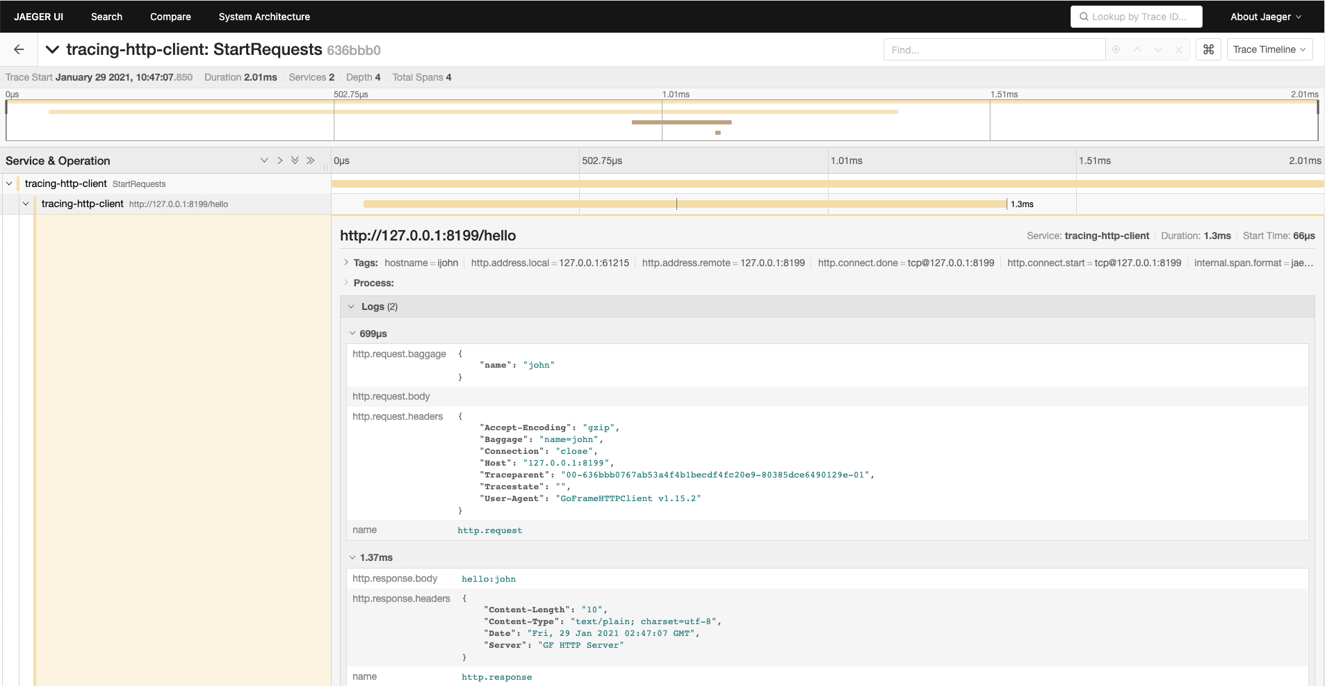 可以看到,客户端提交的 baggage 已经被服务端成功接收到并打印返回。并且客户端在输出日志内容的时候也同时输出的 TraceId 信息。 TraceId 是一条链路的唯一ID,可以通过该ID检索该链路的所有日志信息,并且也可以通过该 TraceIdJaeger 系统上查询该调用链路详情。