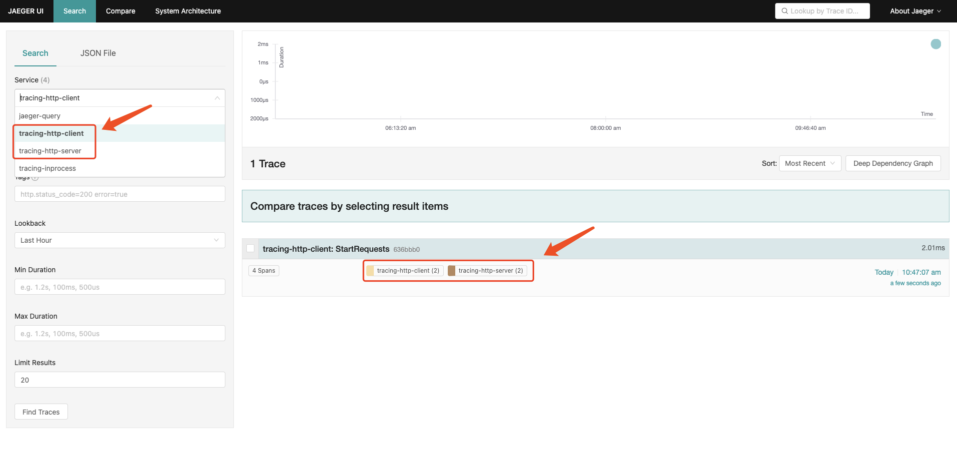 可以看到在这里出现了两个服务名称: tracing-http-clienttracing-http-server,表示我们这次请求涉及到两个服务,分别是HTTP请求的客户端和服务端,并且每个服务中分别涉及到 2span 链路节点。