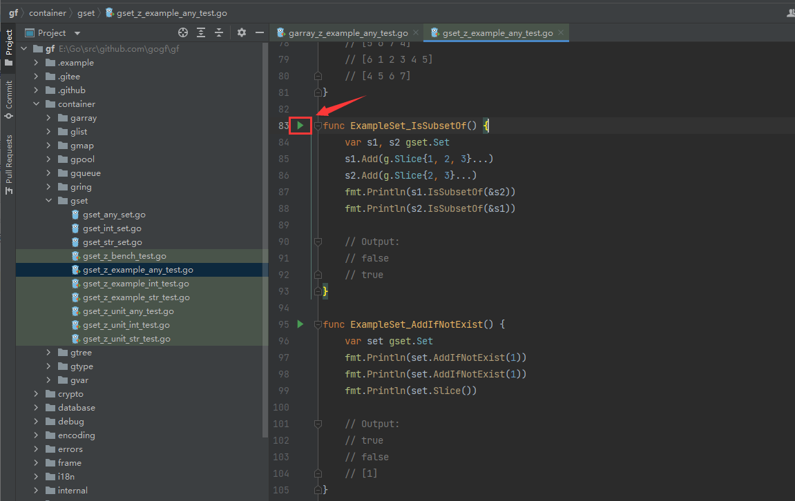 Output 断言注释存在时, Goland 会自动识别该方法可直接运行,方法左侧出现运行图标: