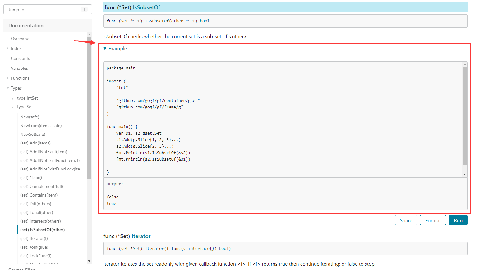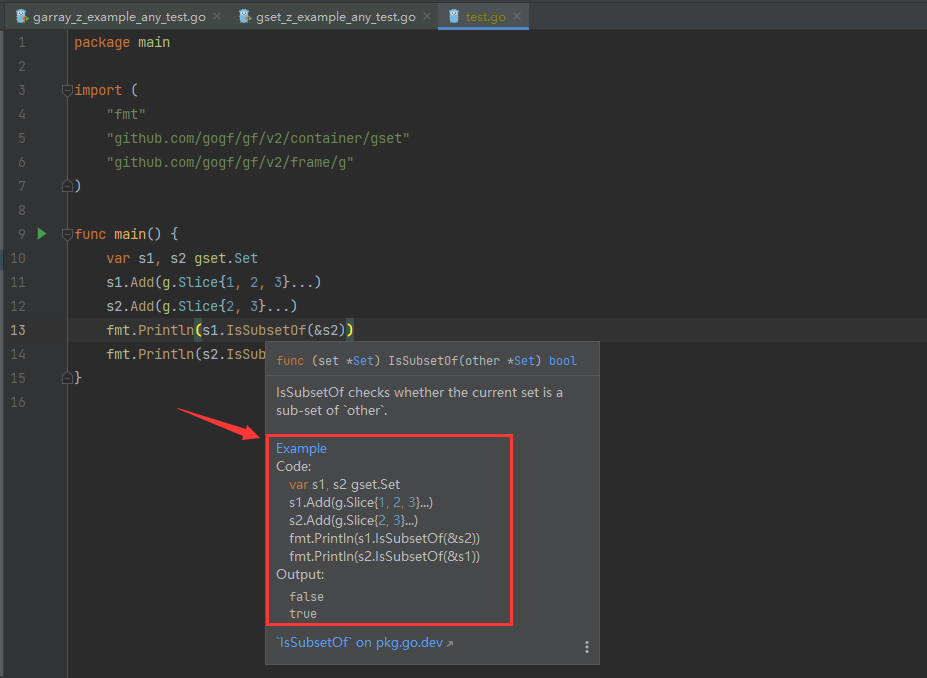 其中 ExampleSet_IsSubsetOfSet 表示该示例针对 gset 包中的 Set 类型, IsSubsetOf 表示示例的是 Set 类型的 IsSubsetOf 方法使用。
