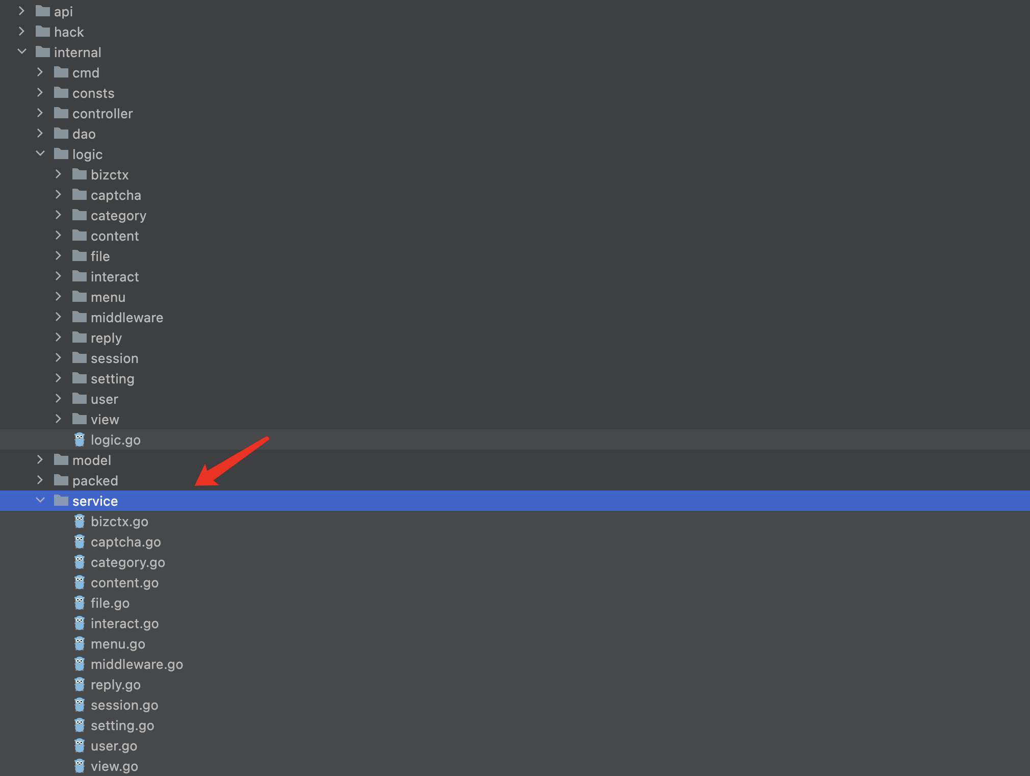service接口,因此只会解析二级目录下的go代码文件,并不会无限递归分析代码文件。以logic目录为例,该命令只会解析logic/xxx/*.go文件。因此,需要logic层代码结构满足一定规范。 - 不同业务模块中定义的结构体名称在生成的