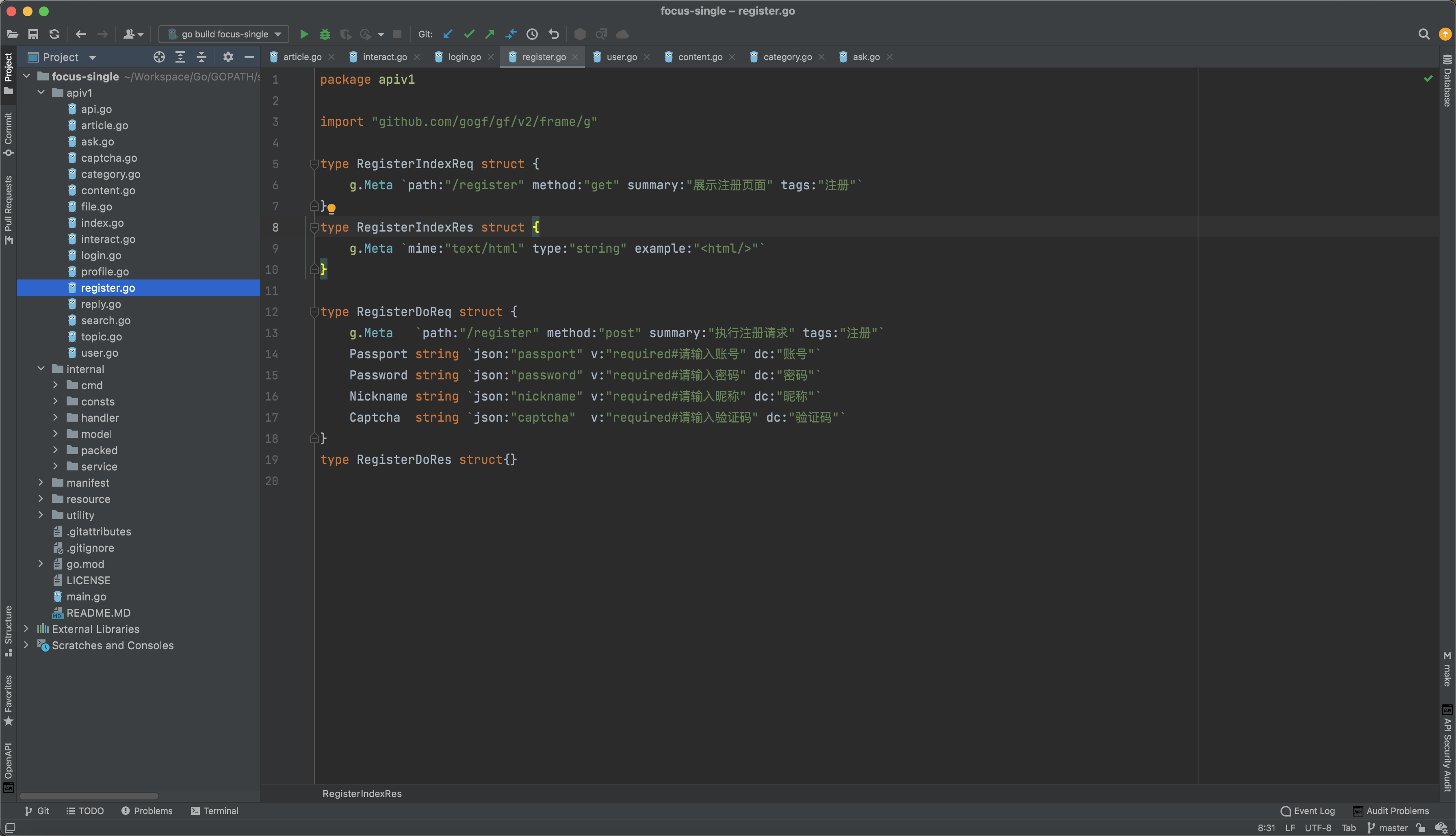 接口输入/输出模型用于系统/服务间的接口交互,定义在 api 接口层中,供工程项目所有的层级调用,例如 controller, logic, model 中均可以调用 api 层的输入输出模型,但是 api 层仅用于与外部服务的接口交互,该模型中不能调用或者引用内部的模型如 model 模型。在 GoFrame 框架规范中,这部分输出输出模型名称以 XxxReq 和 XxxRes 格式命名。