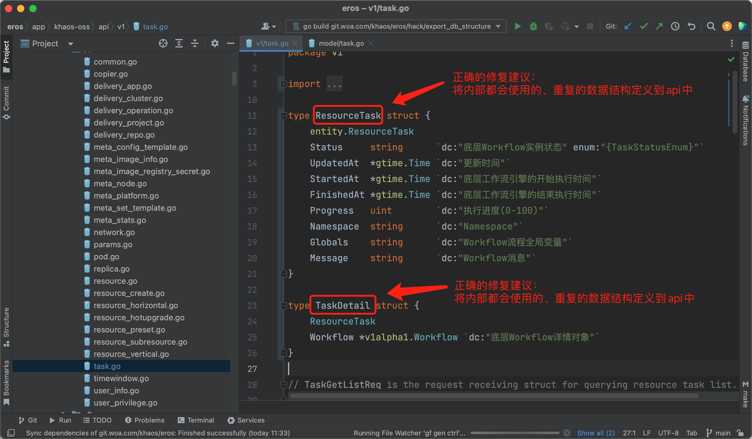 这里需要注意的是,这里的 model 不仅负责维护数据实体对象( entity)结构定义,也包括所有的输入/输出数据结构定义,被 api/dao/service 共同引用。这样做的好处除了可以统一管理公开的数据结构定义,也可以充分对同一业务领域的数据结构进行复用,减少代码冗余。