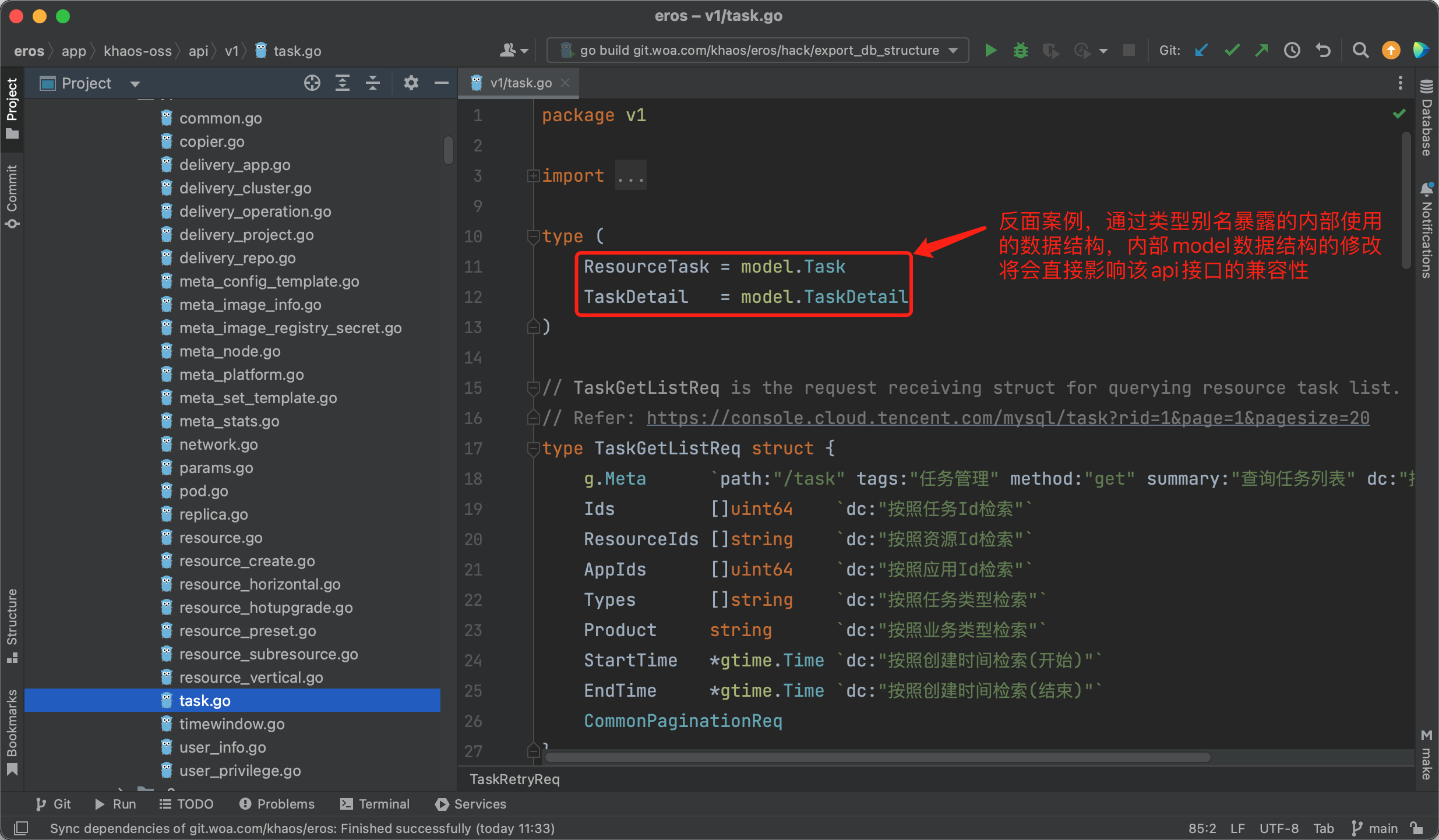 注意 model 中的数据结构不应该直接暴露给外部使用,并且在框架的工程设计中刻意将 model 目录放到了 internal 目录下。也不应该在 api 层中对 model 中的数据结构进行 别名类型定义 供外部访问。一旦将 model 中的数据结构应用到了 api 层中,内部 model 数据结构的修改会直接影响到 api 接口的兼容性。