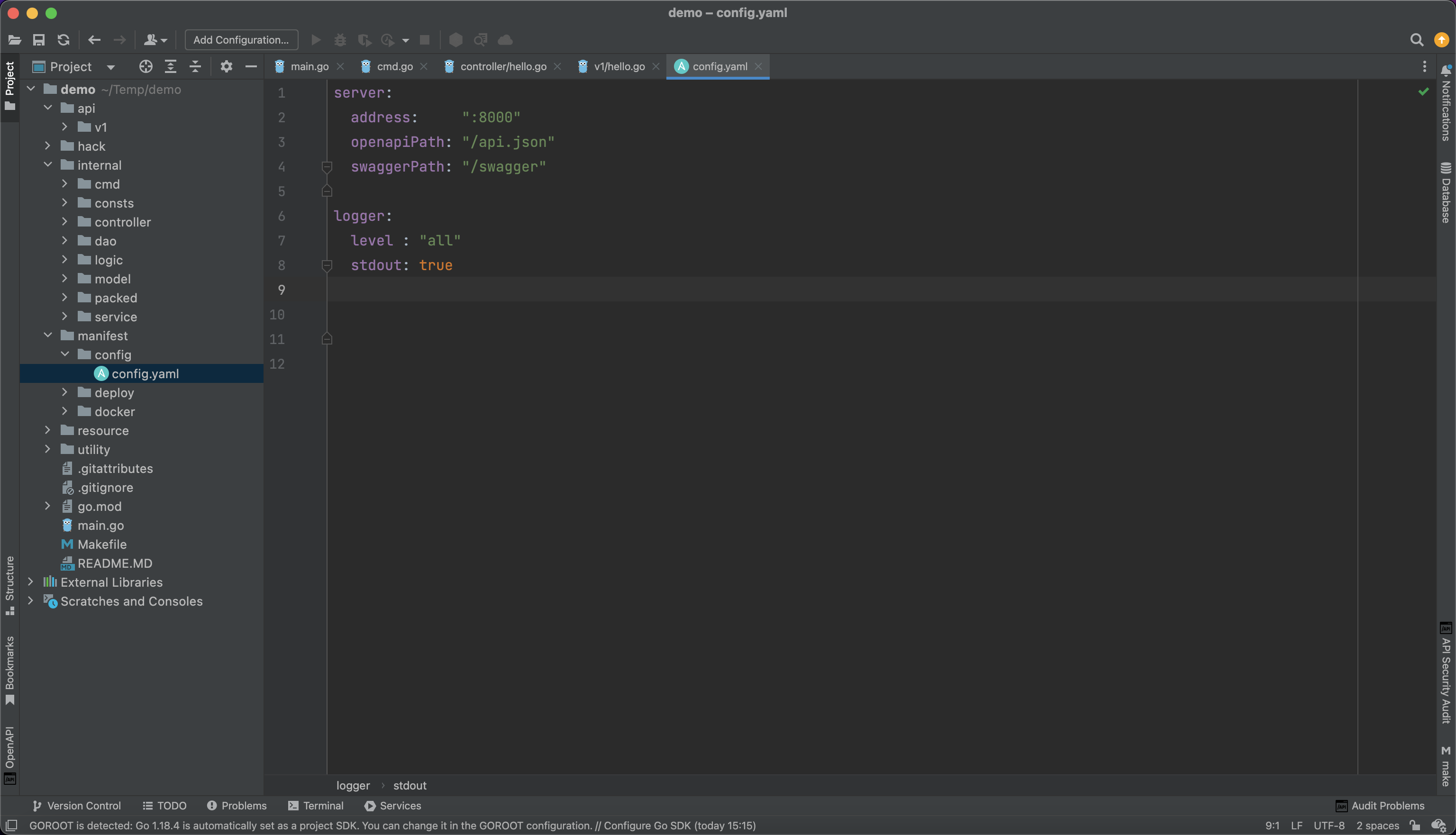 以项目模板为例,默认提供了两个配置项, serverlogger。前者是 HTTP Server 的配置项,后置是日志组件的配置项。前者通过单例对象 g.Server() 自动读取初始化,后者通过单例对象 g.Log() 自动读取初始化。
