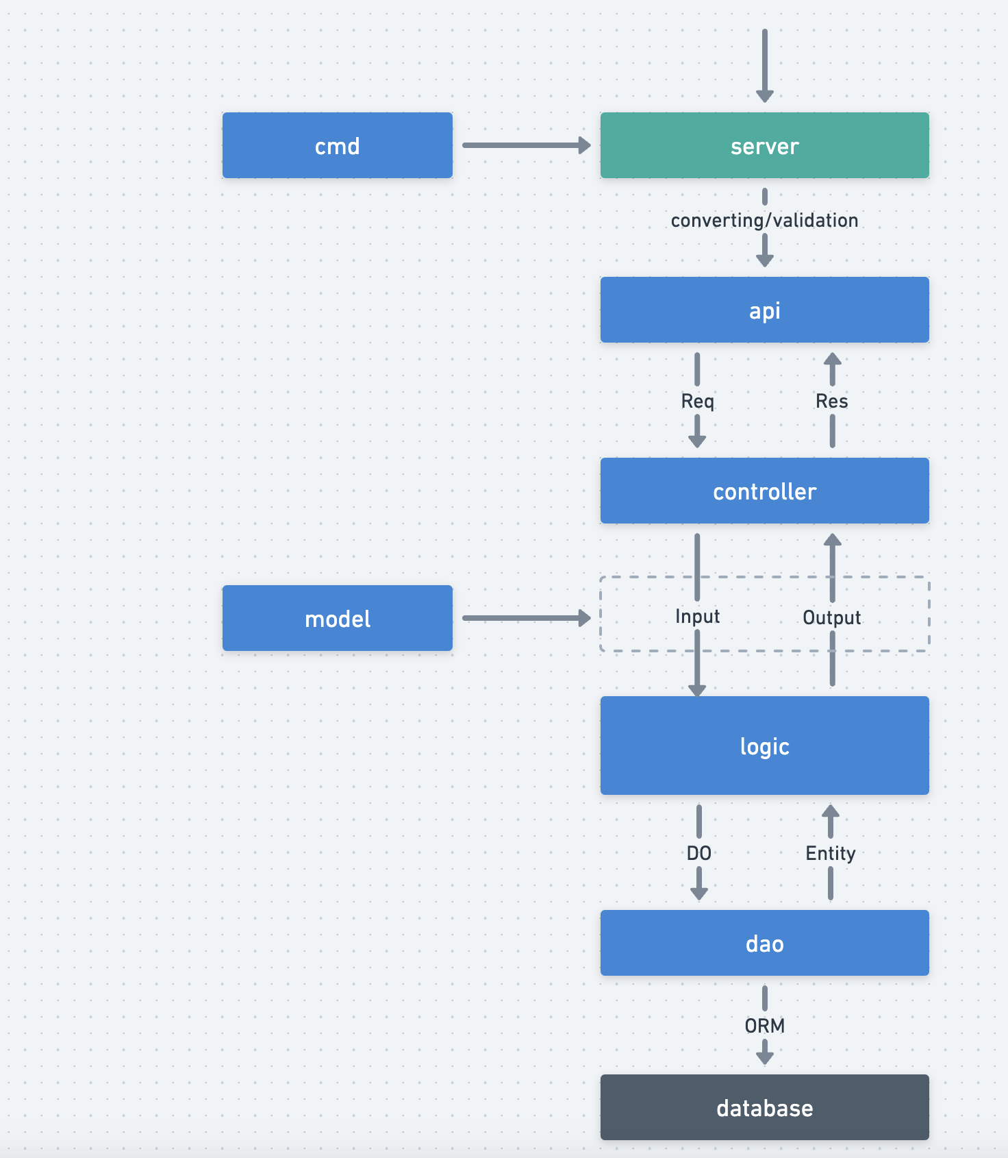 如果两者出现重复的数据结构(甚至常量、枚举类型),建议将数据结构定义到 api 层中。服务内部逻辑可以直接访问 api 层的数据结构。 model 层的数据结构也可以直接引用 api 层的数据结构,但是反之则不行。