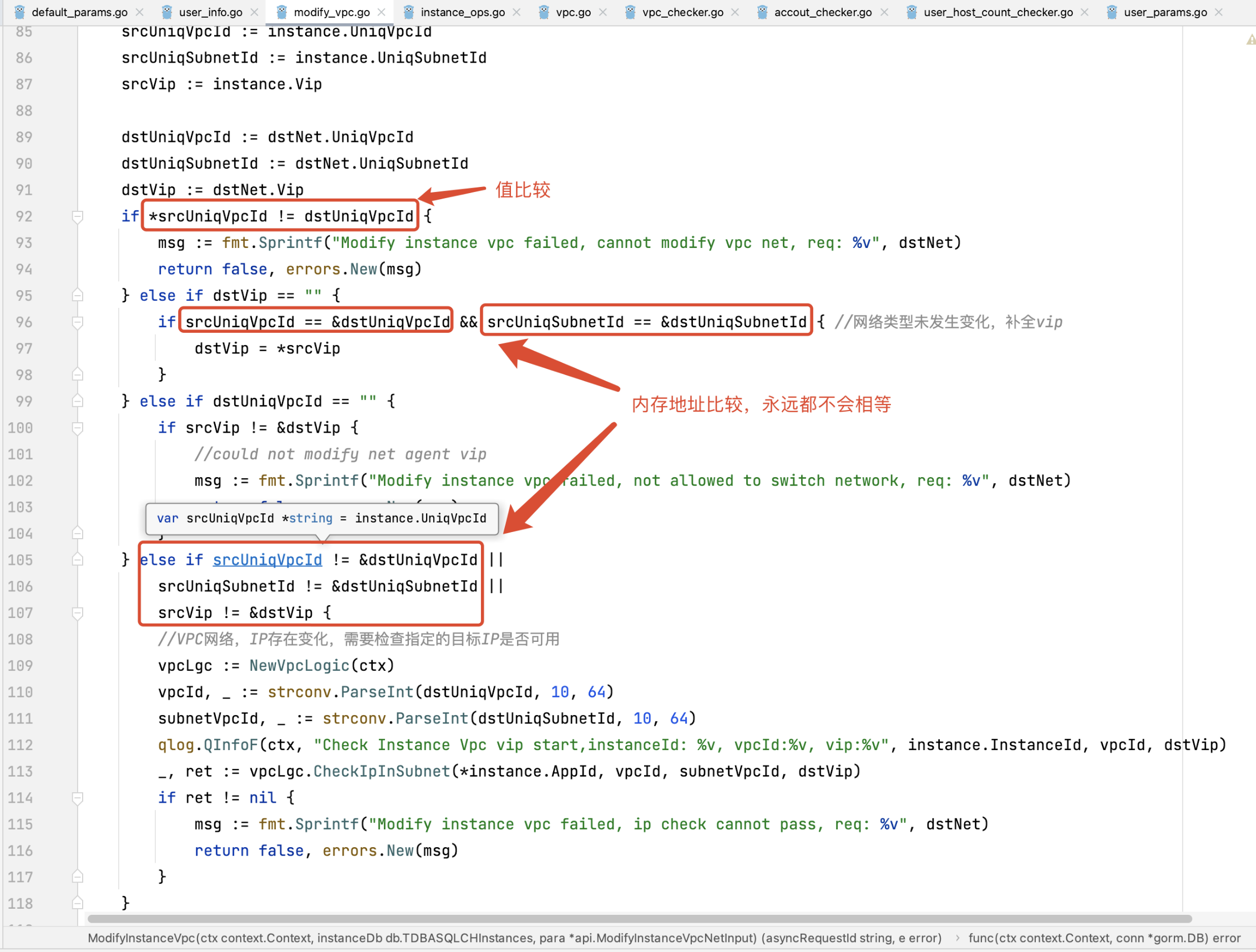 BUG 示例,指针属性使用不当,引起地址比较逻辑错误。