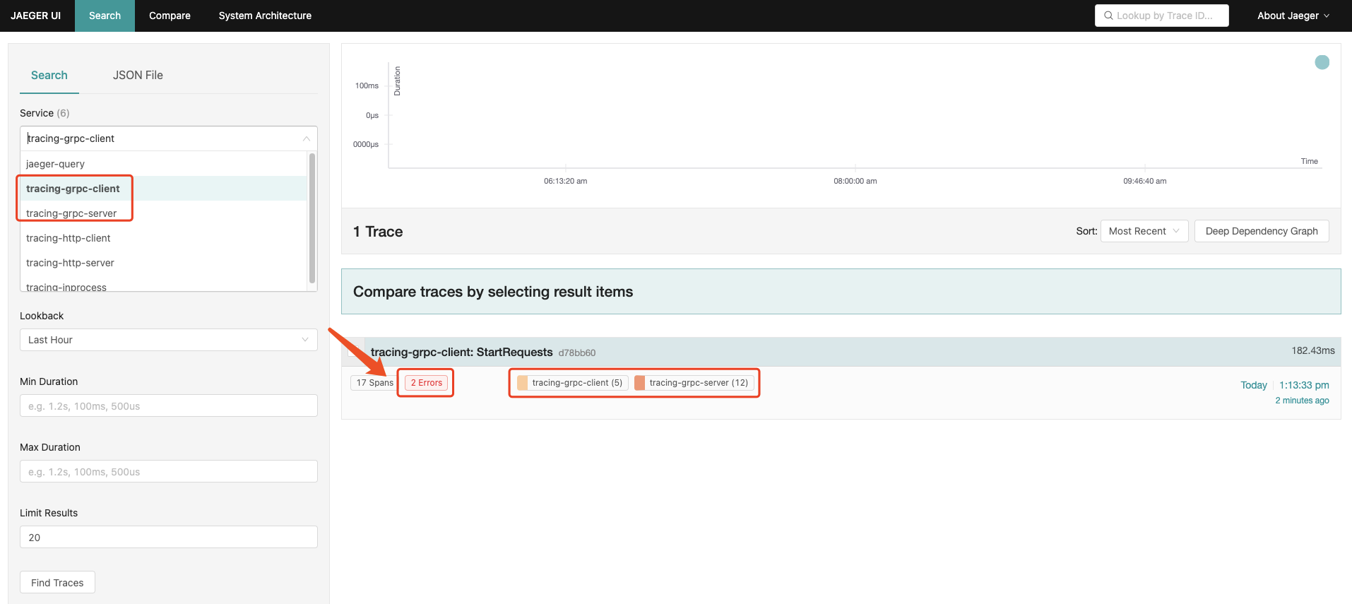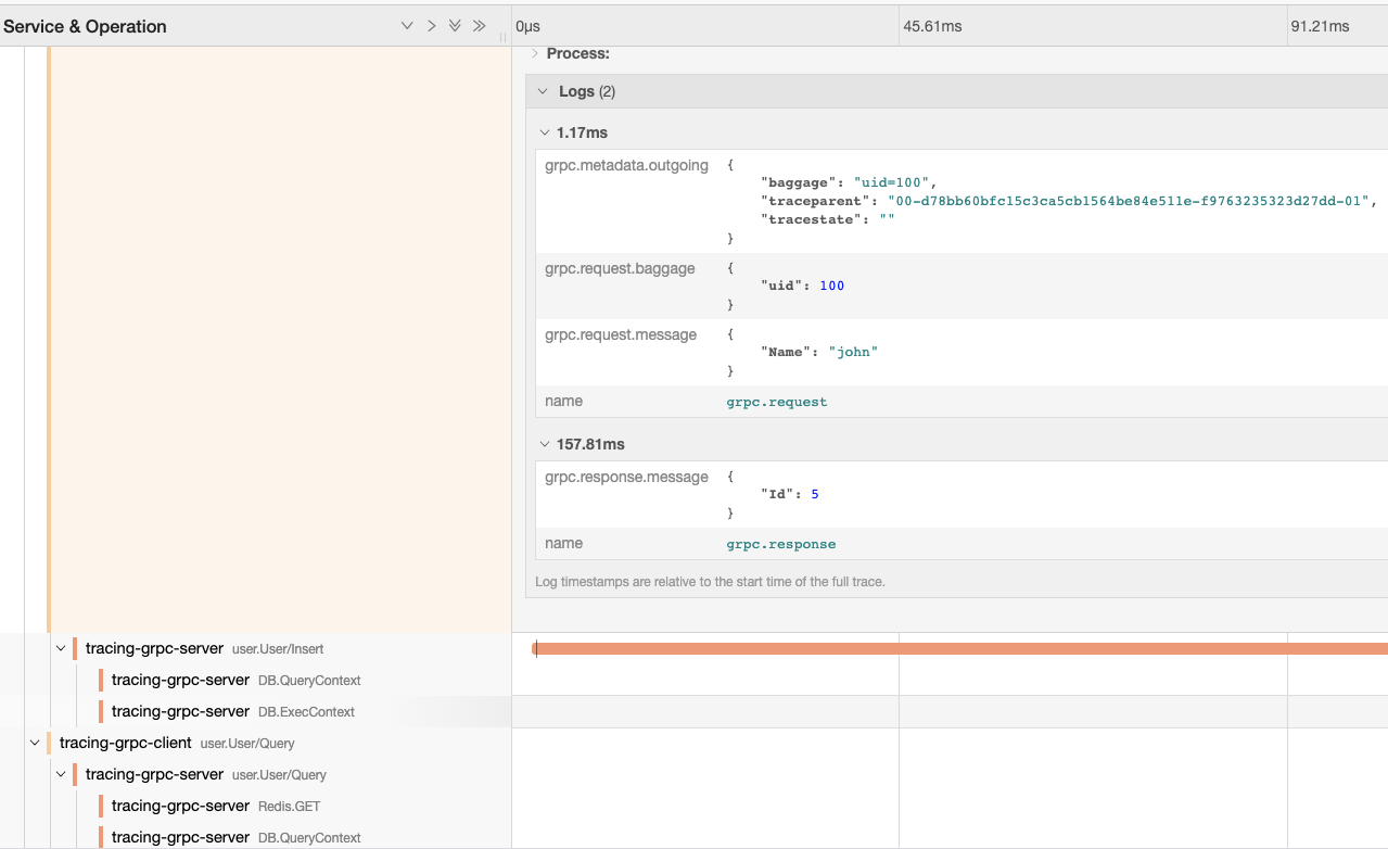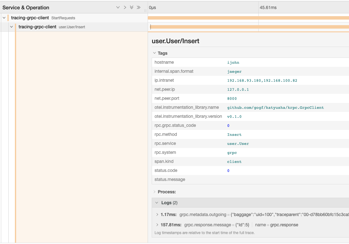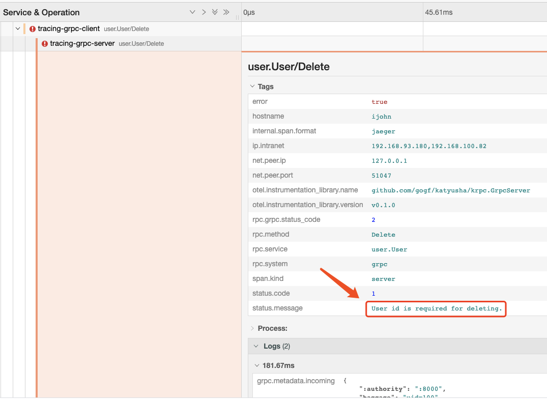 At the end of the client execution here, an error was reported, which we did intentionally, to demonstrate the link information display when GRPC has an error. Let's open jaeger to check the tracing information: