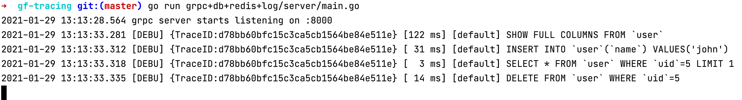 The example code for this chapter is located at: https://github.com/gogf/gf/tree/master/example/trace/grpc_with_db