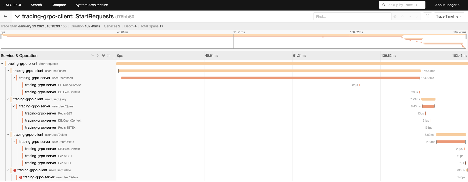 You can see that this request involves two services: tracing-grpc-client and tracing-grpc-server, which are the client and the server. The entire request link involves 17 spans, with the client having 5 spans, the server having 12 spans, and producing 2 errors. Let's click to view the details: