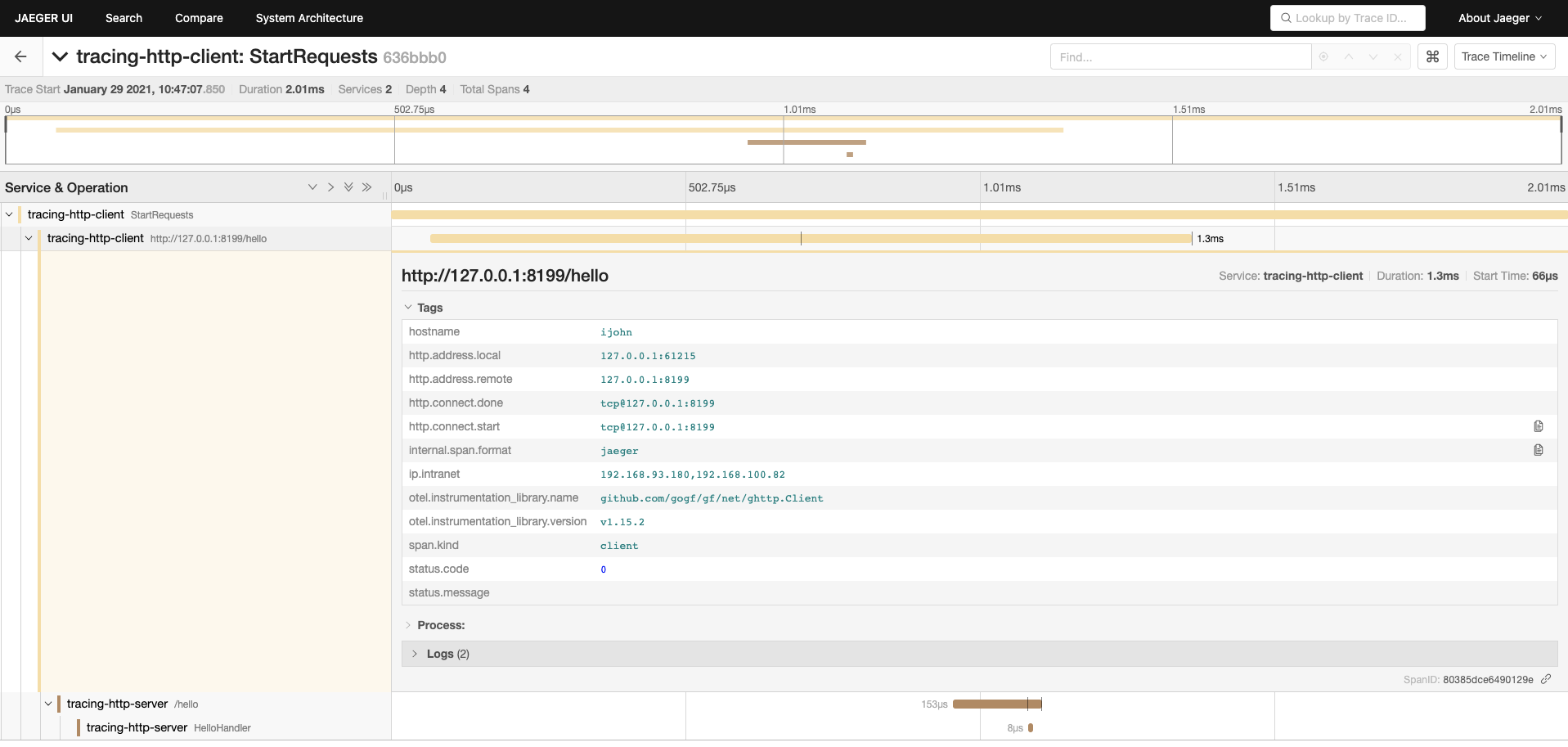 As seen here, there are two service names: tracing-http-client and tracing-http-server, indicating that this request involves two services, specifically the HTTP request client and server, and each service involves 2 span link nodes.