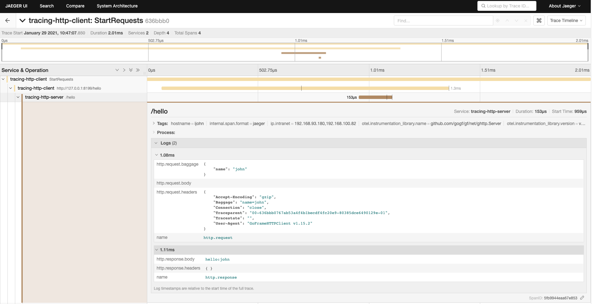 Jaegerthrough thejaeger.Initmethod. - The server starts with tracing enabled, and developers do not need to call any methods or configure any settings explicitly.