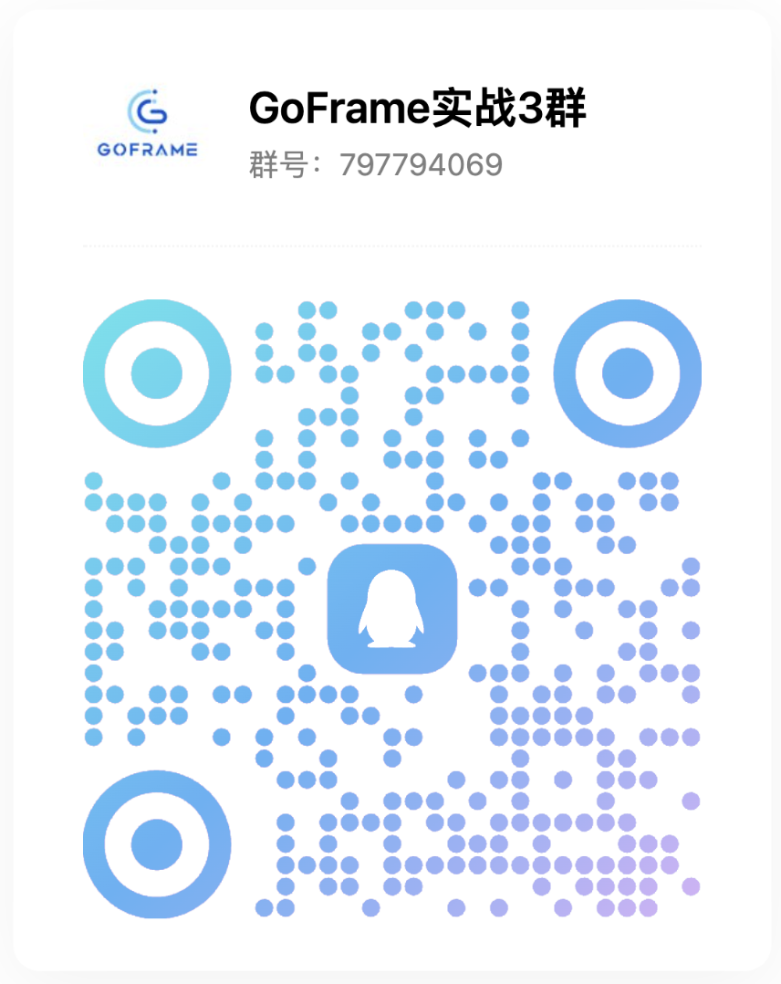 社区交流技术交流群版本:2.10.x(Latest)本页总览加入QQ群 扫描或群号搜索添加。 GoFrame实战1群 已满 GoFrame实战2群 已满 GoFrame实战3群 点击链接加入群聊【GoFrame实战3群】: https://qm.qq.com/q/K7UMKSrVq8 加入微信群 扫描或微信添加 389961817 备注 加群 微信公众号 关注 GoFrame 的发展动态。